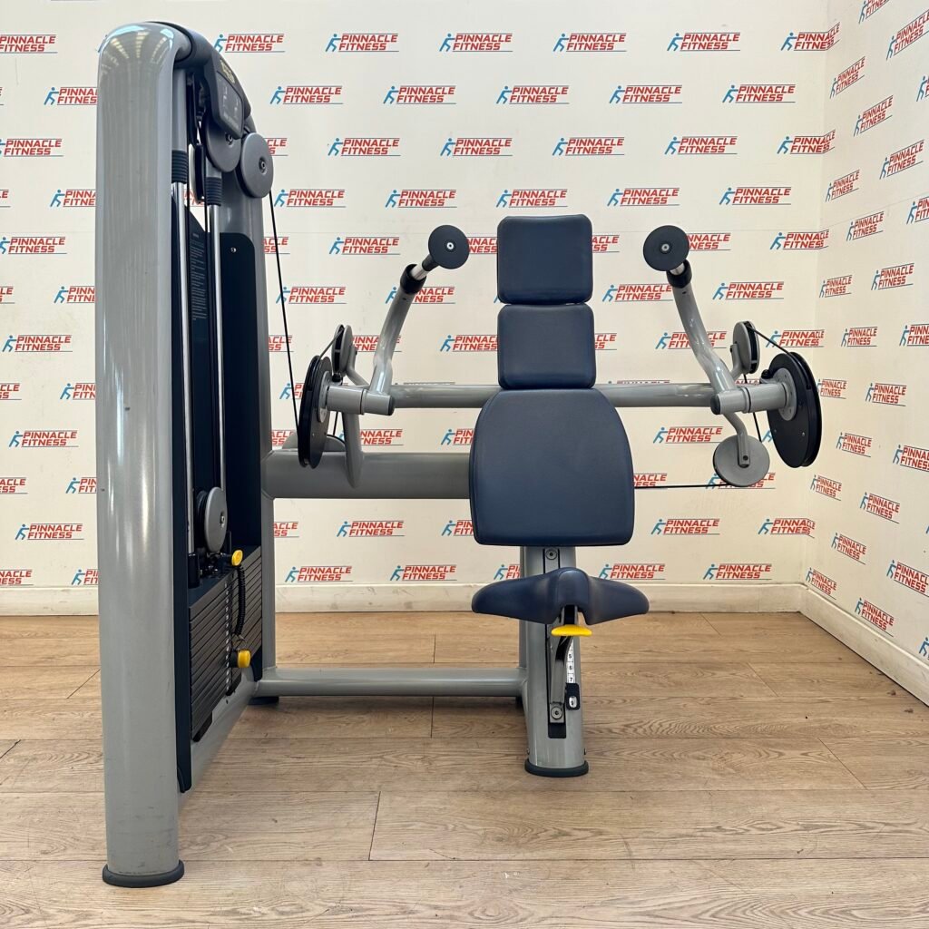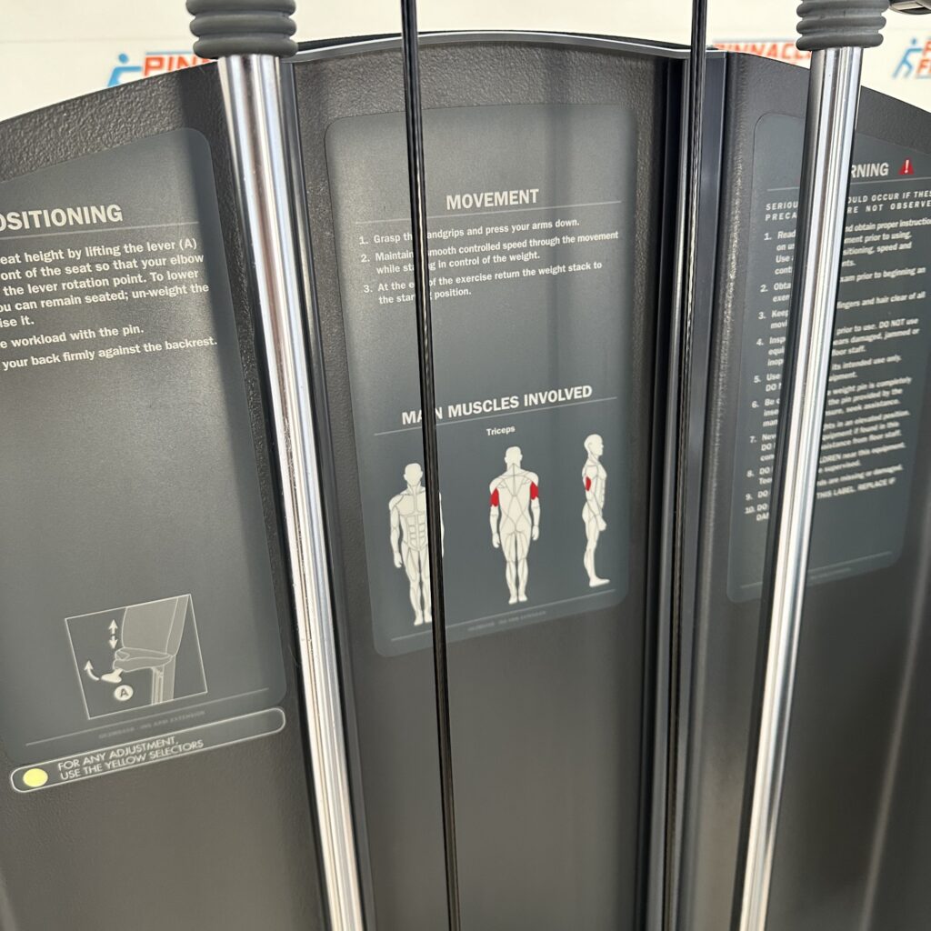 Specific product for building strength in the arm muscles, particularly the triceps. The exercise is performed from a sitting position. It involves extending and flexing the arm downwards at the elbow joint, using the handgrips on the two independent levers. Resistance is provided by a weight stack which enables the workload to be adjusted to suit each type of user.