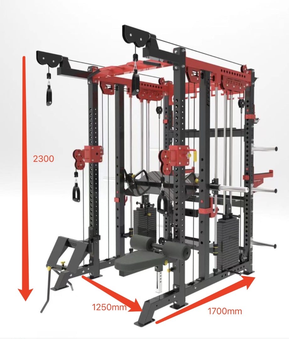 Introducing the most heavy duty functional trainer, dual adjustable pulley rack and smith system in one complete machine.
