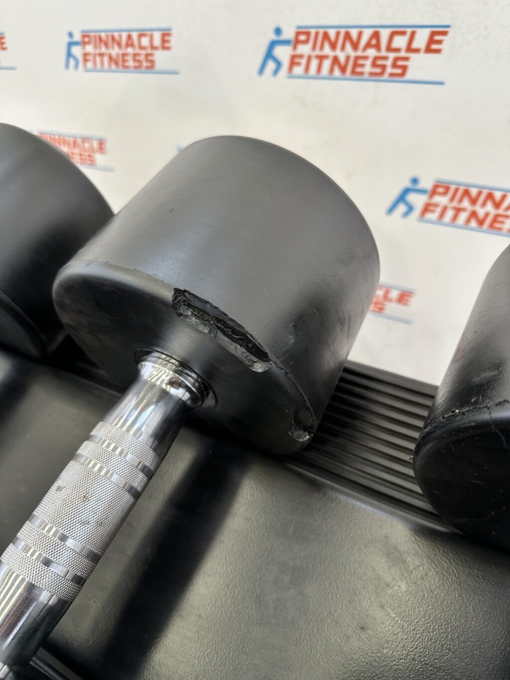 The dumbbells and rack are in well used but good cosmetic condition. 2 of the dumbbells have a litttle pice of rubber missing from the inside edge as pictured but this does not affect the use. Please see pictures for more detail.