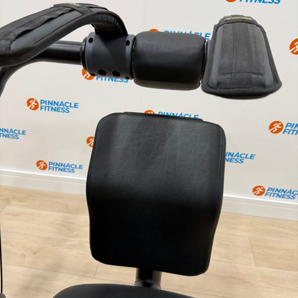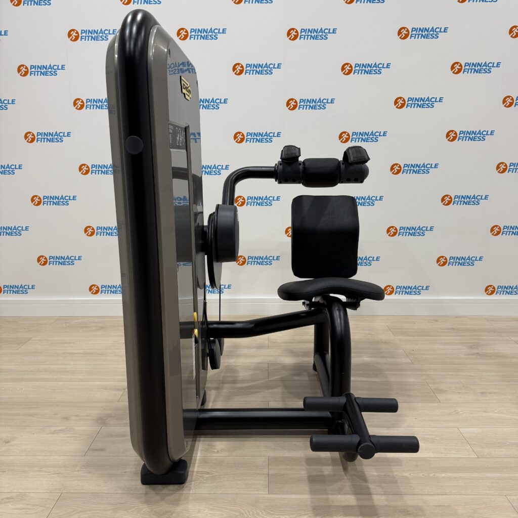 Innovative back pad shape stabilizes the pelvis to better isolate the abdominal muscles